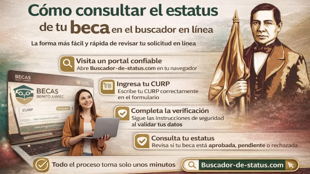 Busca la sección llamada “Buscador de Estatus”. Esta herramienta te permite revisar el progreso de tu solicitud y ver actualizaciones importantes sobre tu beca.
